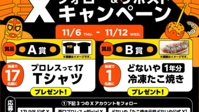 17LIVE&元祖どないやpresents『西口DXプロレス』11/25開催 記念キャンペーン 賞品: 「プロレスって17Tシャツ」 17名様 「元祖どないや冷凍たこ焼き1...
