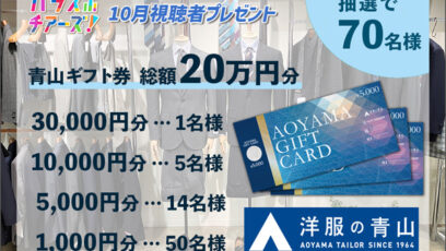 ネット応募の懸賞青山ギフト券最大30,000円分を合計70名様にプレゼント 締切:2025-10-31 Fun! J:COM‐プレゼントキャンペーン 賞品: 青山ギフト券30,000円分…1名様 青山ギフト券10,000円分…5名様 青山ギフト券5,000円分…14名様 ...ネット応募の懸賞ギフト券・商品券が当たる懸賞