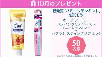 ネット応募の懸賞オーラツーミーステインクリアペースト ハニーレモンミント&オーラツーミーハブラシステインクリア ふつうを50名様にプレゼント 締切:2025-10-31 クラブサンスター‐今月のプレゼント 賞品:オーラツーミーステインクリアペースト ハニーレモンミント&オーラツーミーハブラシステインクリア ふつう(50名様) 締切:2025...ネット応募の懸賞